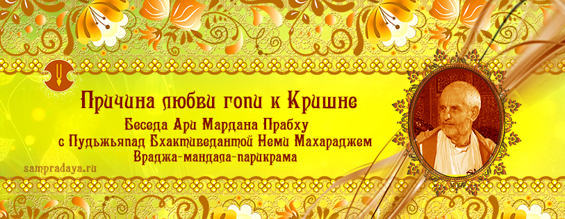 Во время Враджа-мандала-парикрамы преданные приехали со всего мира, чтобы пройти её под руководством и по приглашению Шрилы Бхактиведанты Нараяны Госвами Махараджа. Приезжие преданные могли познакомиться с санньяси, которые помогали провести эту парикраму, задать им вопросы и обрести более глубокое понимание таттвы и сиддханты. Ниже представленная беседа, которая состоялась по дороге в Камьяван, где Ари Мардан дас впервые познакомился с Бхактиведантой Вишну-дайватой Махараджем и задал ему вопросы по духовной традиции Гаудий.
